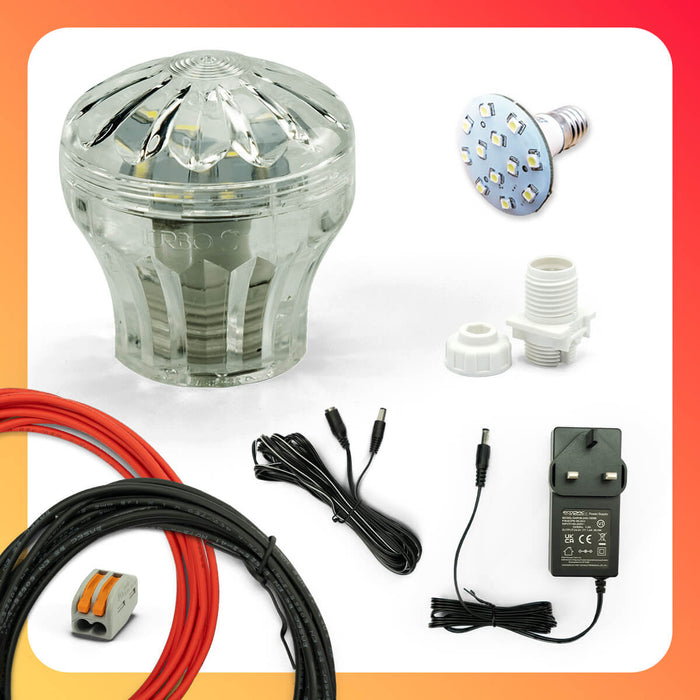 Our Marquee kits are very similar to the standard Fairground light Kits, except we've swapped out the power supply and cables for 'Plug'n'play' alternatives.